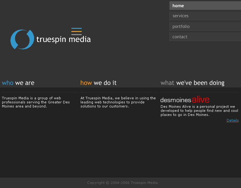 After realizing that we were mainly focusing on web development and not the other services we offered, we decided to redesign our website. This version of our site was much lighter and contained only information relevant to development. With this release we also drastically updated our outdated portfolio. with all of the work we were doing, we didn't have enough time to update our own site!