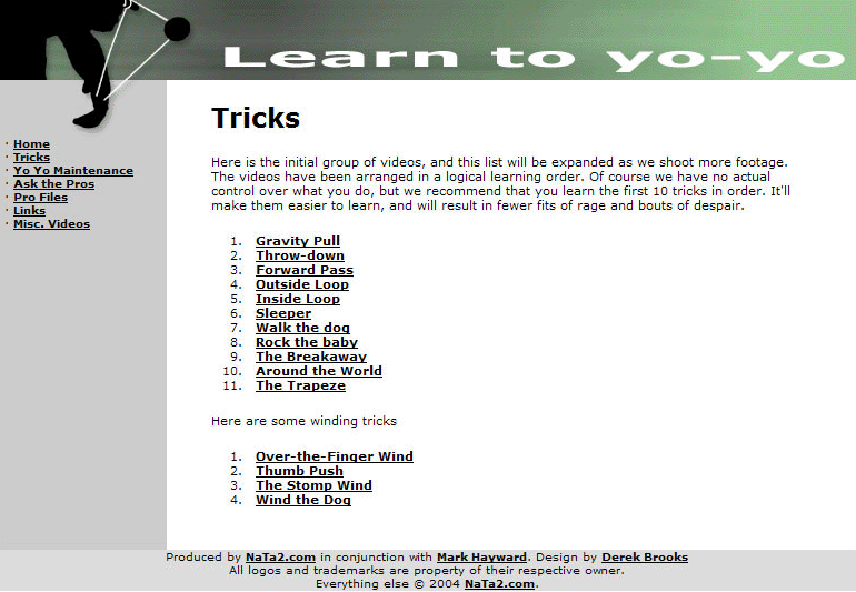 Learn To Yo-YoOctober 2003CSSGraphic DesignHTMLLearn to Yo-Yo was a site dedicated to teaching kids new yo-yo tricks. Pro yo-yoers would update the site with videos and tutorials. My job in this project was to simply come up with a lite front end design, which you can see displayed here.